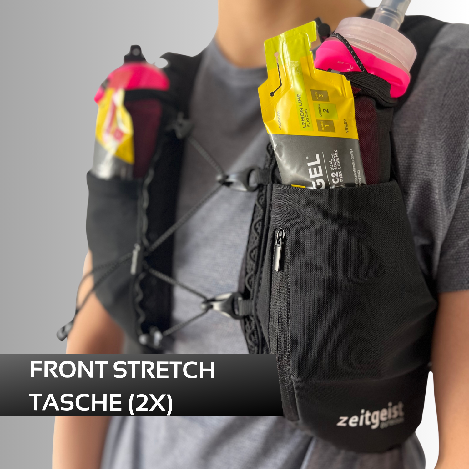 Mit 1,5 L oder 2,0 L Volumen liefert dir dieses Setup ausreichend Flüssigkeit für lange Trainingsläufe oder Marathonvorbereitung – ohne zusätzliches Frontgewicht.